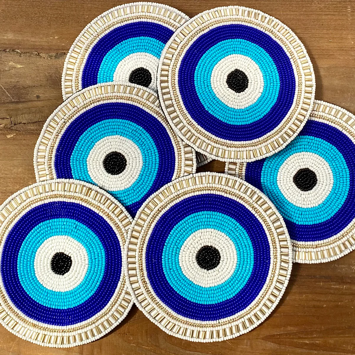 These exclusive to Lockwood hand-beaded Evil Eye Coasters are such a fun addition to any bar, coffee table, or kitchen. A blue evil eye is specifically believed to bring protection from bad karma and fate.